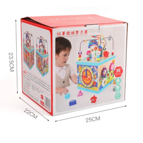1、Wooden Activity Toy Cube: It consists of 5 sides, the top is a roller coaster with beads, which guides baby to observe movement trajectory and exercise hand-eye coordination. The other 4 sides are gear linkage, shape matching, clock recognition, and letter recognition. The five-sided puzzle gameplay promotes baby’s sensory development.