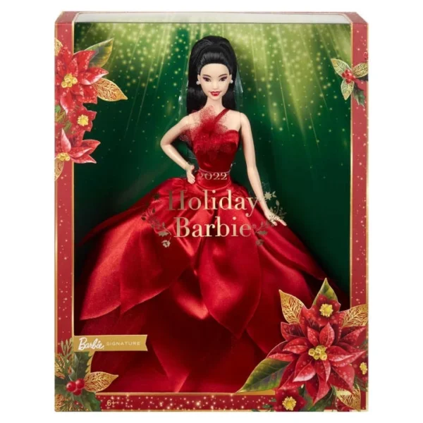 It's the time of year for giving, gathering, and creating heartwarming memories that will last a lifetime. 2022 Holiday Barbie® Doll embodies the spirit of the season in a vibrant, red gown inspired by the beautiful poinsettia, a symbol of good will and community spirit. Her ensemble dazzles with a shimmering poinsettia detail at the neckline and a layer of tulle and satiny petals adorning her long, full skirt. Gorgeous, golden chandelier earrings and red lips complete her look. In packaging that's ideal for display, this collectible 2022 Holiday Barbie® doll makes a great gift for 6 year olds and up. Includes doll stand and Certificate of Authenticity. Doll cannot stand alone. Colors and decorations may vary.